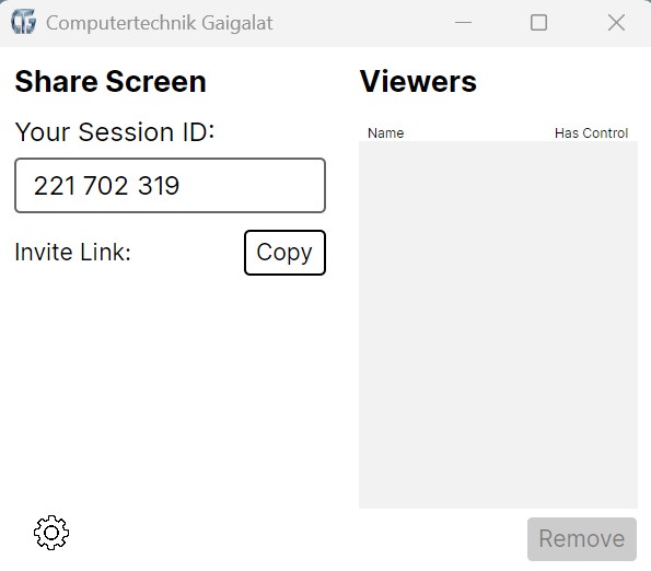 Achtung: Es kann sein, dass Ihr Antivirenprogramm die Ausführung verhindert. Dann bitte die Ausführung explizit zulassen oder den Virenschutz temporär, für den Dauer der Remote-Sitzung, deaktivieren. - Nachden das Programm gestartet wurde erscheint folgendes Fenster: